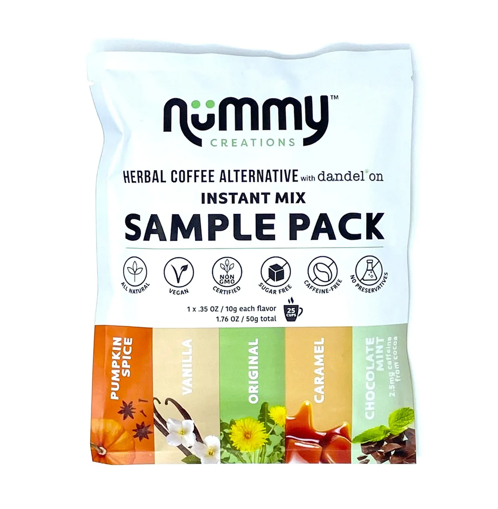 Get all 5 flavors in a convenient sample pack: Original, Vanilla, Caramel, Chocolate-Mint, and Pumpkin Spice. Enjoy a bold "pretend" coffee, latte, iced coffee, espresso - however you enjoy your traditional coffee, in all it's caffeine-free glory! Makes 5 cups(10g) per flavor, 25 cups (50g) total.