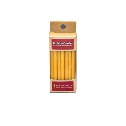 A pack of 20 Natural beeswax birthday candles. Made with 100% pure Canadian beeswax, Honey Candles® use only cotton or paper wicks, with no toxins or harmful ingredients, zinc and lead-free. Handmade and classically dipped. Best of all, beeswax birthday candles won't drip all over your birthday cake! Try these beeswax birthday cake candles and you'll never go back to paraffin birthday candles!