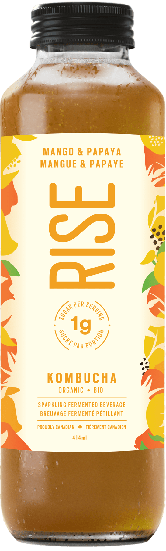 Filtered water, mango juice*, active kombucha culture*, oolong tea*, pineapple*, mango*, papaya*, natural flavours (papaya, mango*, passion fruit), white tea*, turmeric*, orange peel*, green tea*, rose hips*, lemongrass*, xanthan gum, Reb A (stevia leaf extract)*, carbon dioxide.