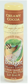 *Theobroma Cacao (Organic & Fair Trade CertifiedTM Cocoa) Butter, *Olea Europaea (Organic Extra Virgin Olive) Oil, *Cera Alba (Organic Beeswax), *Ricinus Communis (Organic Castor) Oil, *Aloe Barbadensis (Organic Aloe) Extract, and CO2 Extracts of *Rosmarinus Officinalis (Organic Rosemary), *Rosa Canina (Organic Rosehip), & *Hippophae Rhamnoides (Organic Seabuckthorn). * = certified organic