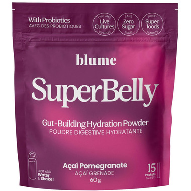 Blume is on a mission to create a kinder wellness world. At Blume that looks like simple, daily habits that fill your cup. Hydration and gut health are interconnected & foundational to feeling your best. SuperBelly combines a love for superfoods with prebiotics (from inulin), fermented apple cider vinegar, and probiotics that can contribute to a healthy gut. Get a good gut feeling from your hydration and fill your cup with Blume.