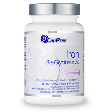 Taking a daily iron supplement is a quick and easy way to pump the body’s stores, but not all supplements are free from uncomfortable side effects like constipation, diarrhoea, stomach upset and nausea. CanPrev’s Iron Bis-Glycinate 20 contains iron bisglycinate, a chelated iron that is easy to absorb, gentle on the stomach and doesn’t cause gastrointestinal upset like those that contain ferrous sulphate can.