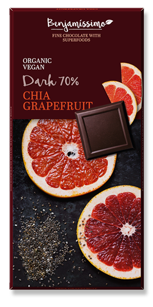 Ingredients: cocoa mass*, cane sugar*, cocoa butter*, chia seeds* (2%), sunflower lecithin*, grapefruit oil* (0,1%), orange oil*, lemon oil*, Bourbon vanilla*.